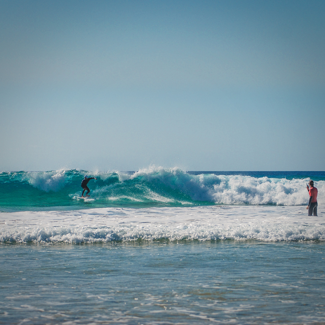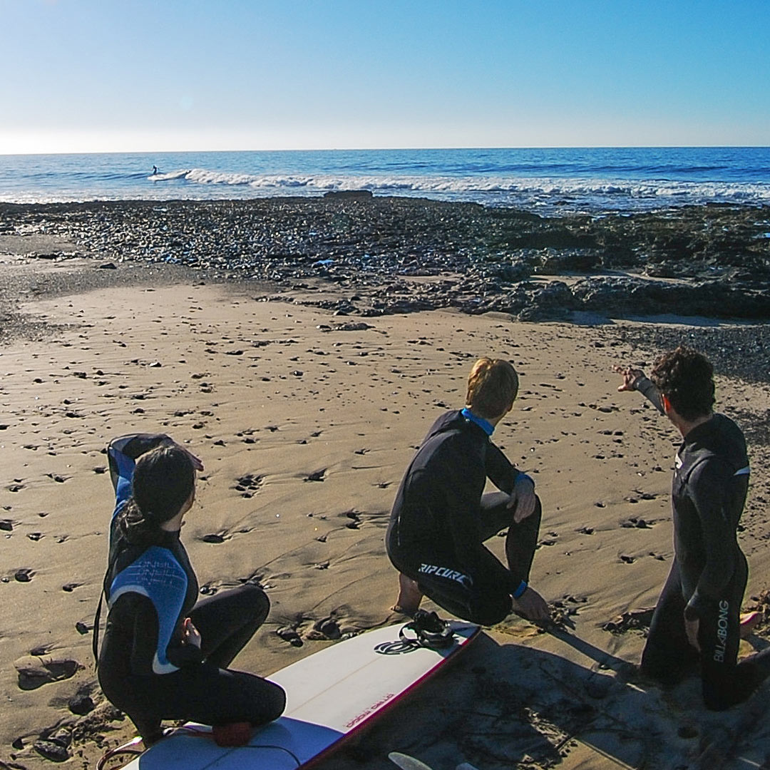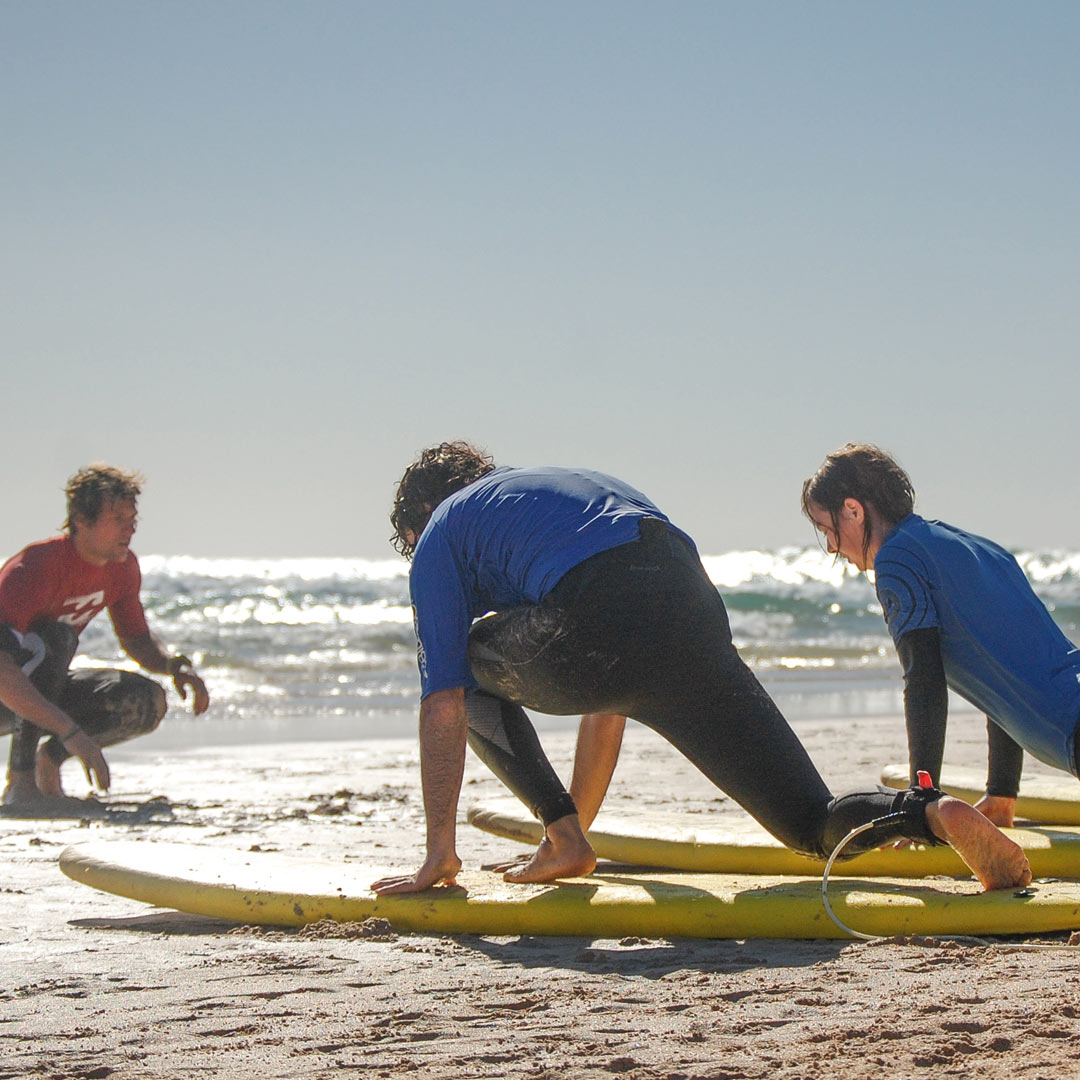 Una volta in spiaggia, ti spieghiamo le correnti, le condizioni delle onde e ti mostriamo dove puoi fare surf in tutta sicurezza. Poi ti presentiamo l’obiettivo del giorno e lo esercitiamo insieme a terra.